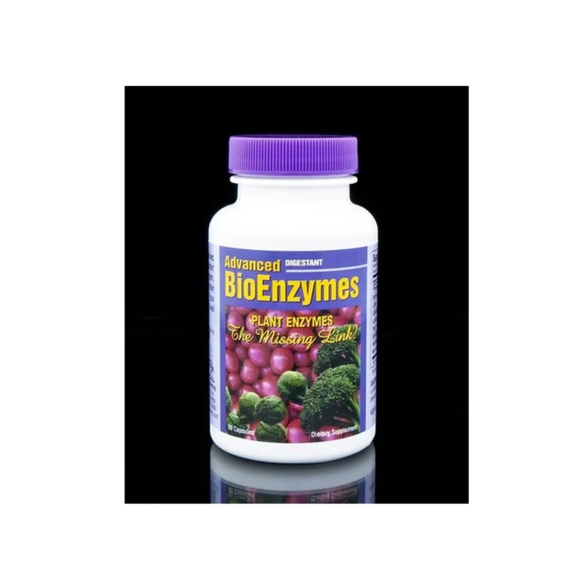 Plant-based digestive enzyme complex with protease, amylase, lipase, papain, and bromelain for optimal digestion.
